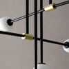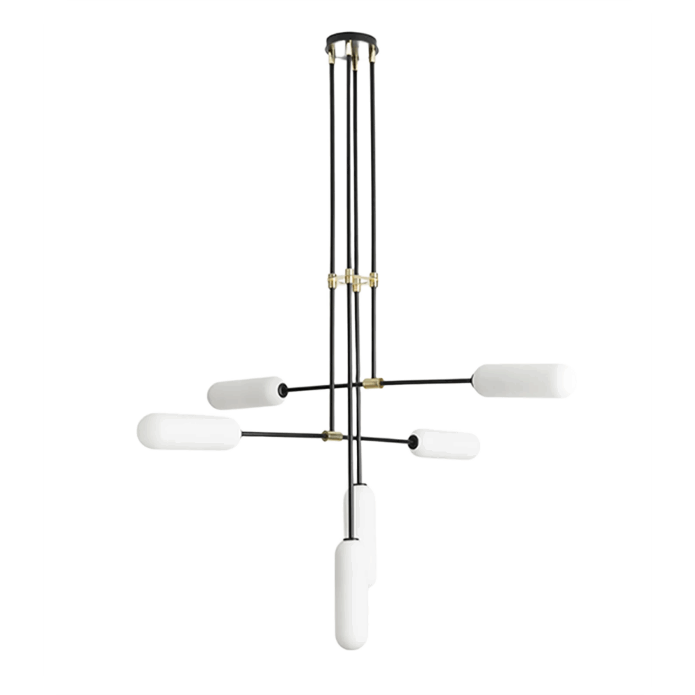 Atil 6lt Pendant Light designed Pepe Fornas for Aromas Del Campo features opal glass lampshades that are placed in different positions and heights, creating an original retro vintage style indoor fixture. The Atil Collection is also available in a single pendant light that comes in two finishes (matte black and brass).