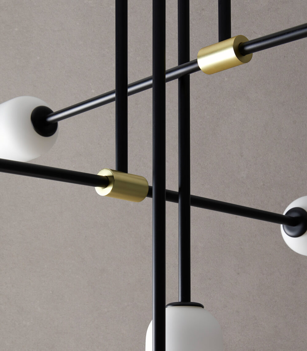 Matte Black with brass details and opal glass shade. 2060 max drop