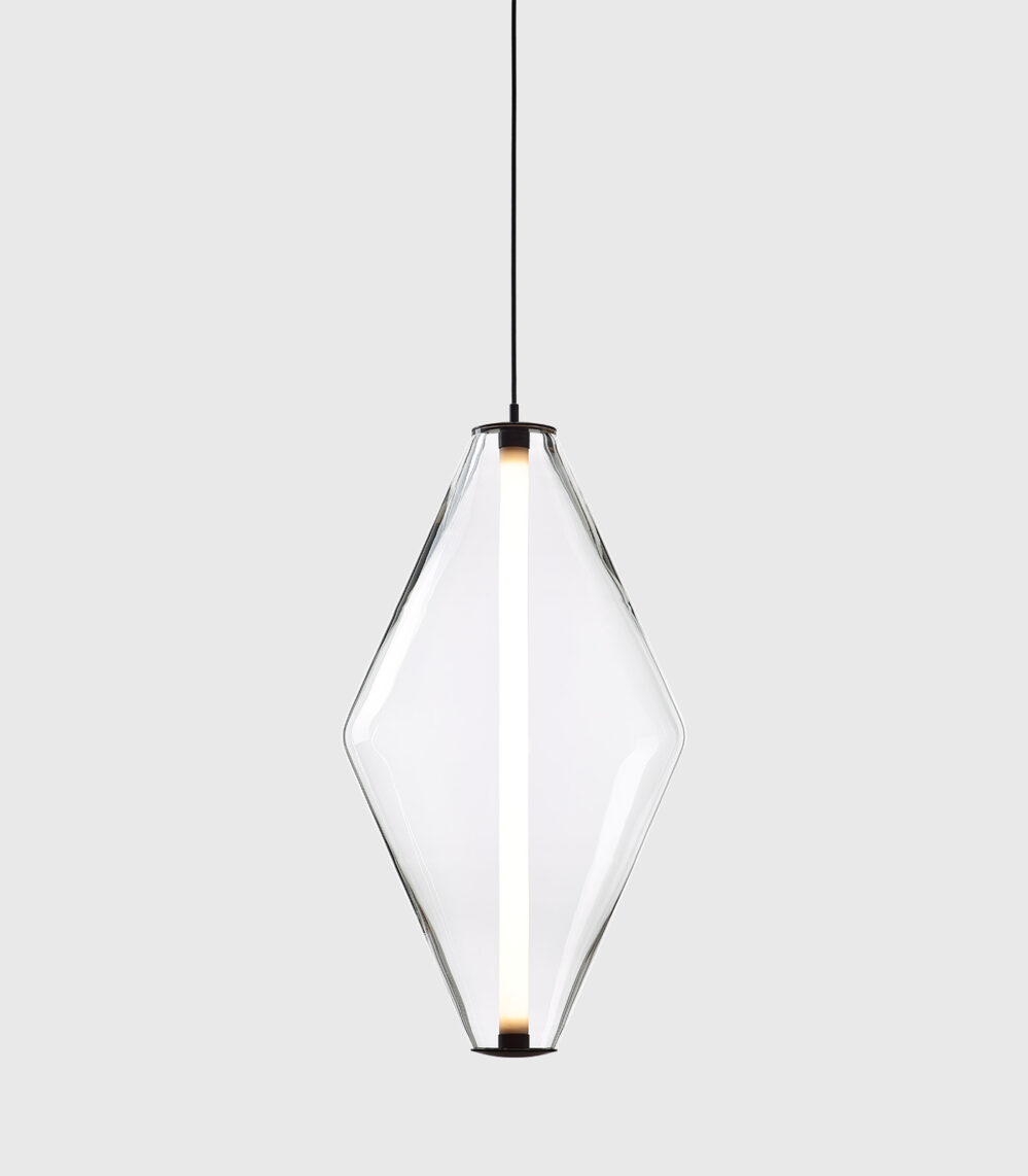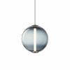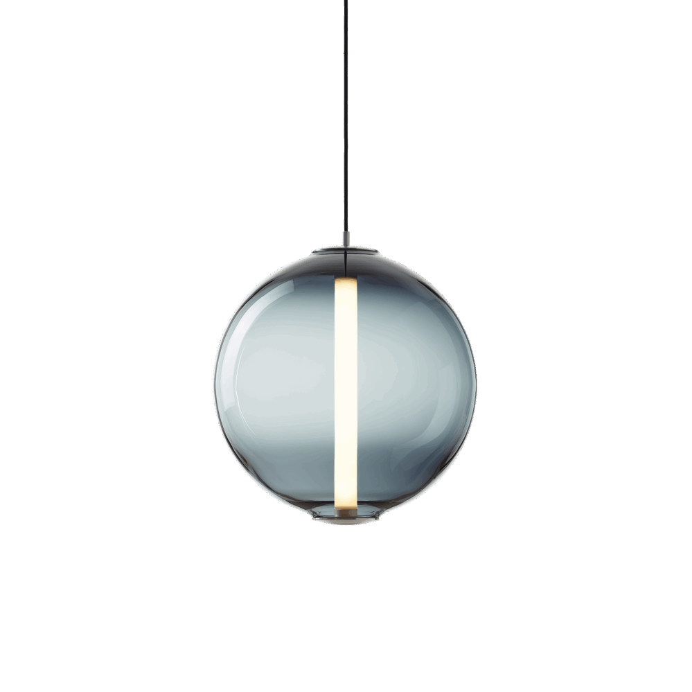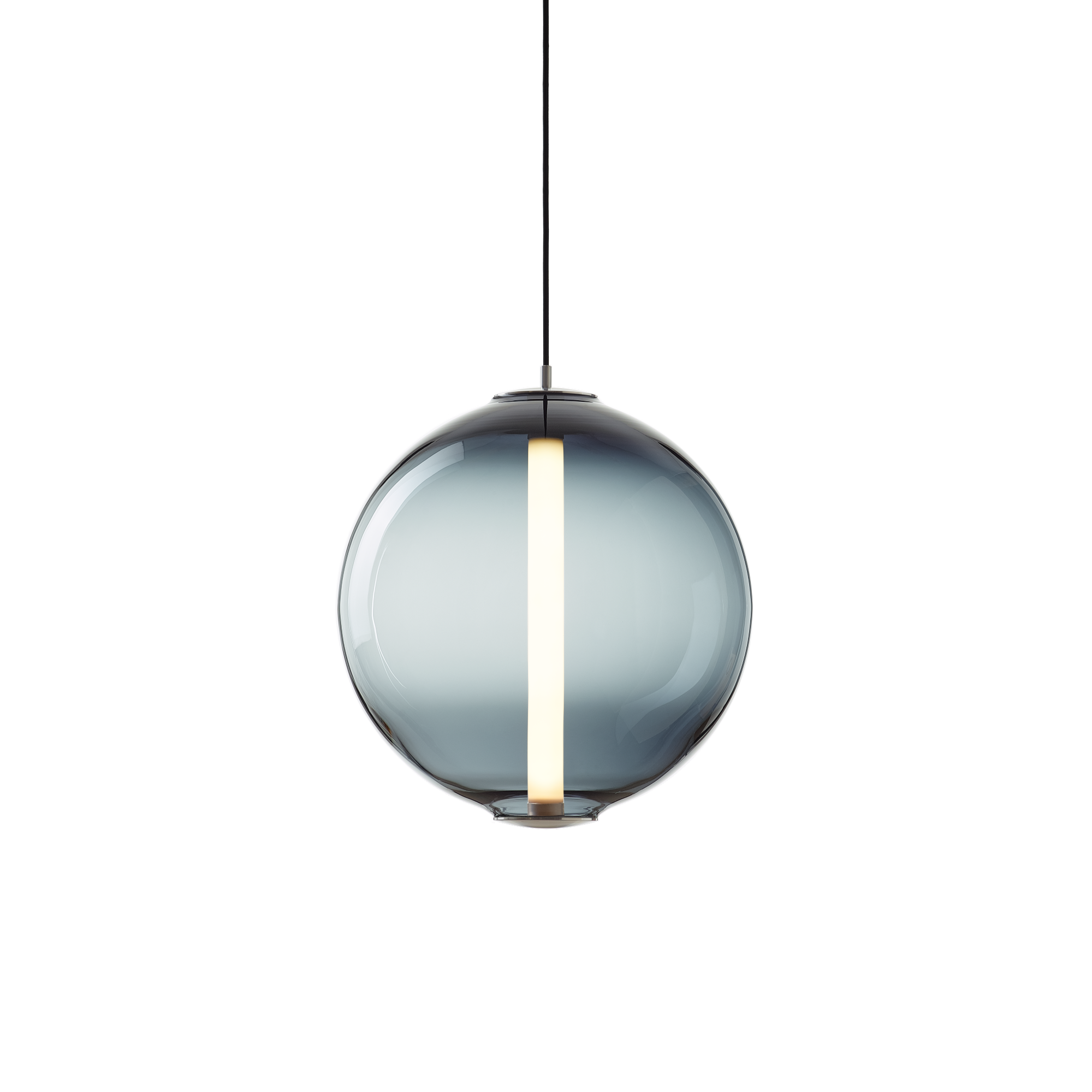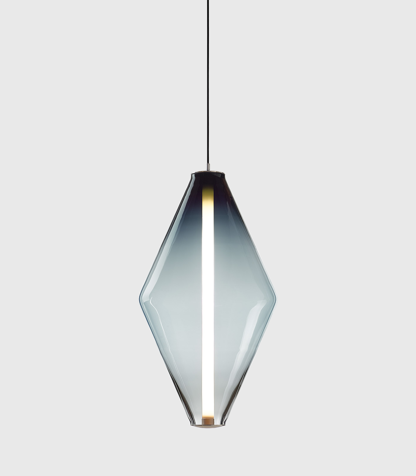 Buoy’s diffusion light rod running through the glass body is made from sandblasted polycarbonate that perfectly distributes the light. In its center are numerous LED chips, while the upper and lower part of the light are enclosed by a metal plate. The metal comes in either a silver or black version that can be further combined with various tones of glass.