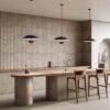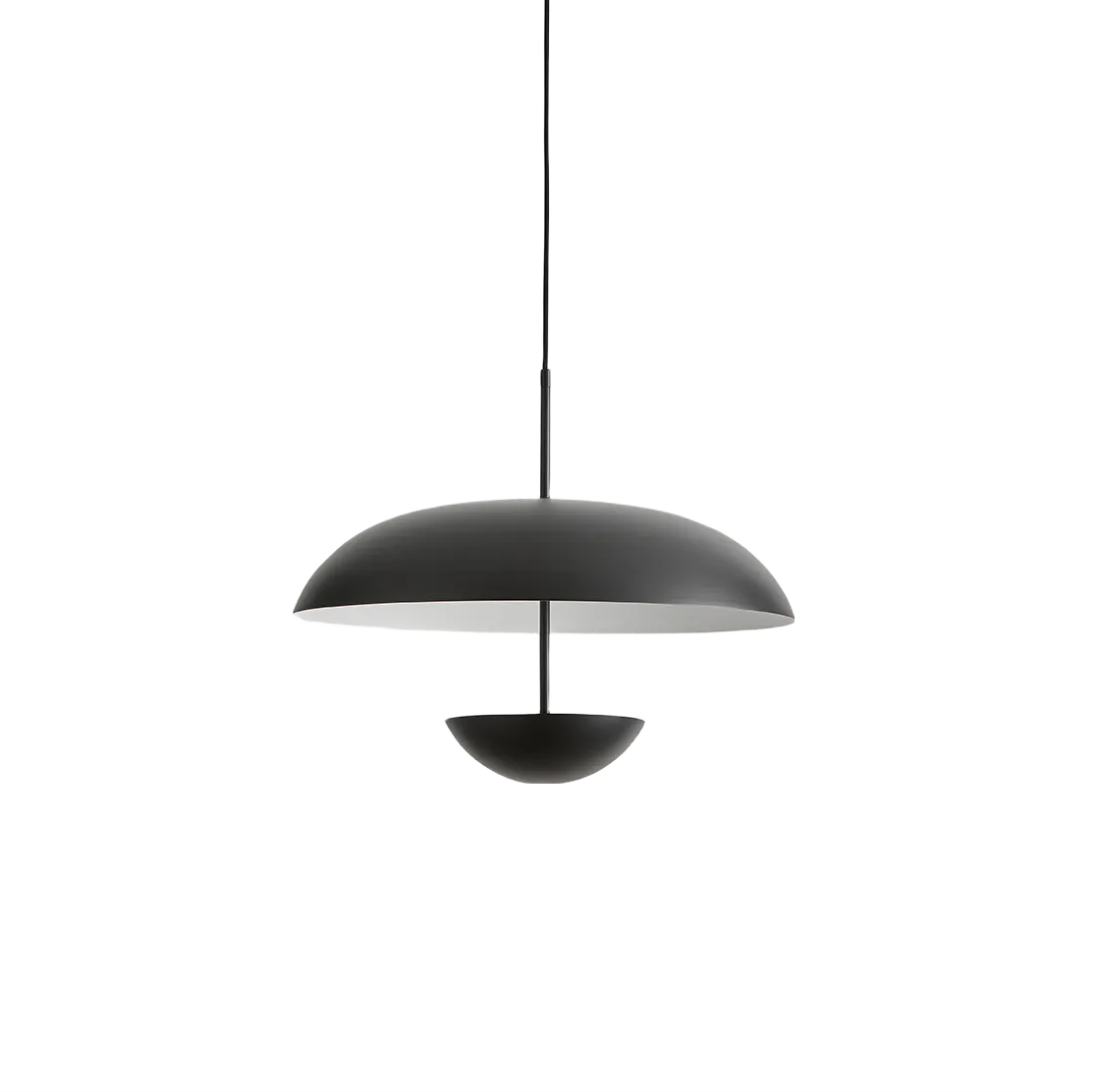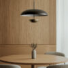 Ella Pendant Light designed by AC Studio for Aromas is a minimal indoor light fixture featuring a large shade in a matte black exterior and a matte white interior. The diffuser is direct upwards into the large shade which then illuminates a soft light evenly around the structure. The Ella Collection is an ideal light for the kitchen bench, dining table or living room.