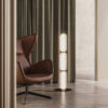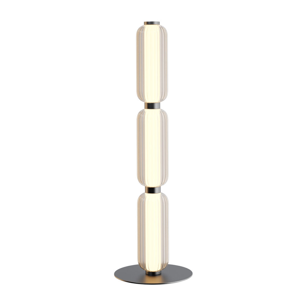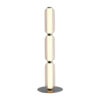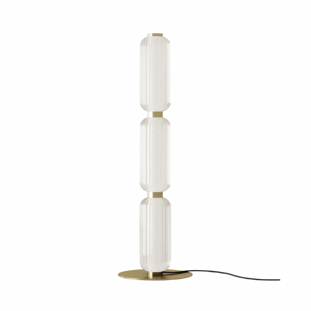 Elma Floor Lamp designed by Jose Fornas for Aromas has a beautifully delicate aesthetic. This floor lamp incorporates three horizontal cylinders of transparent striped glass surrounding an opal acrylic centre with ethereal qualities. Each glass piece is linked at each end by a simple circular metal fixture to create the perfect balance between contrasting materials.