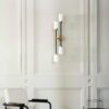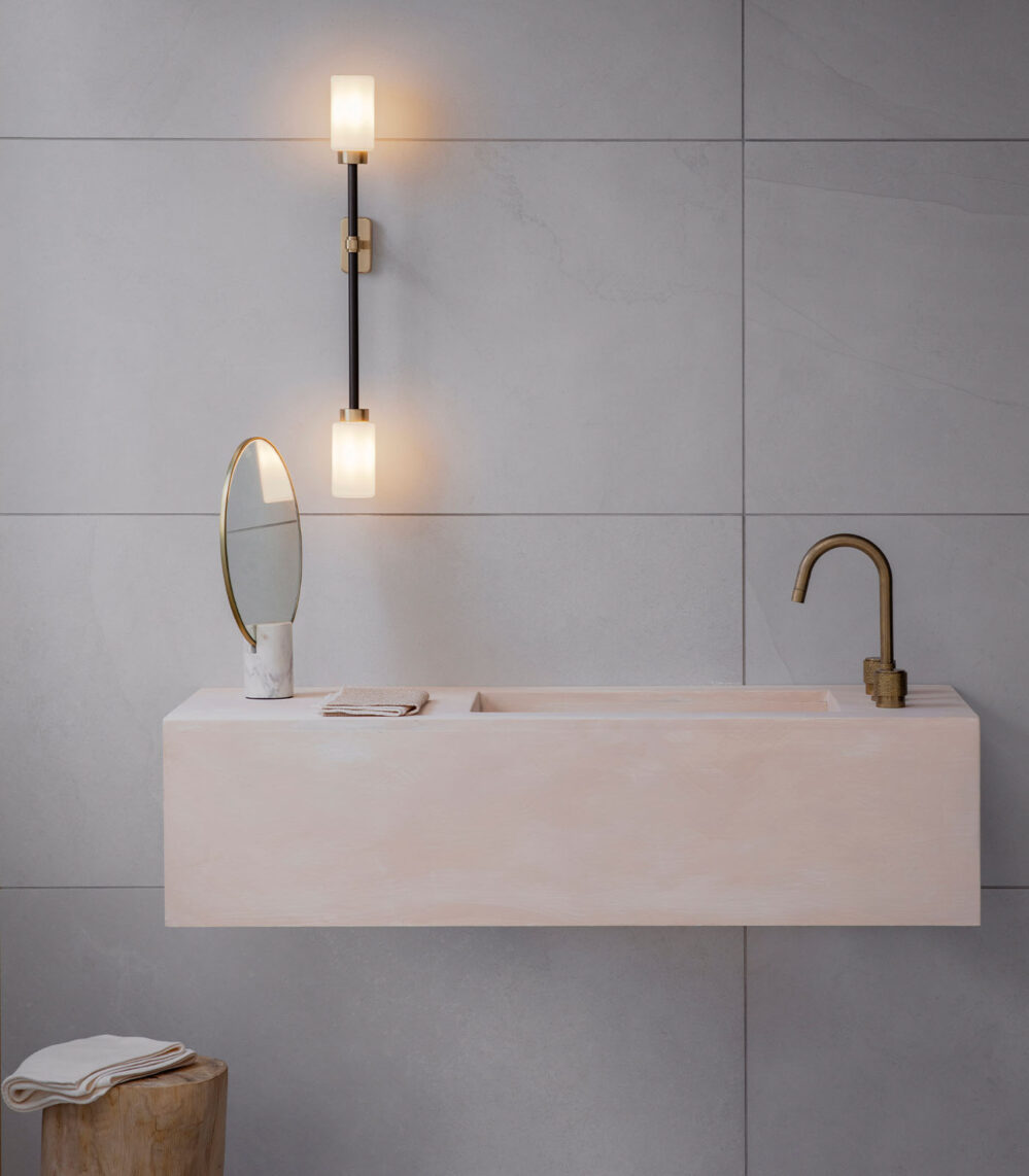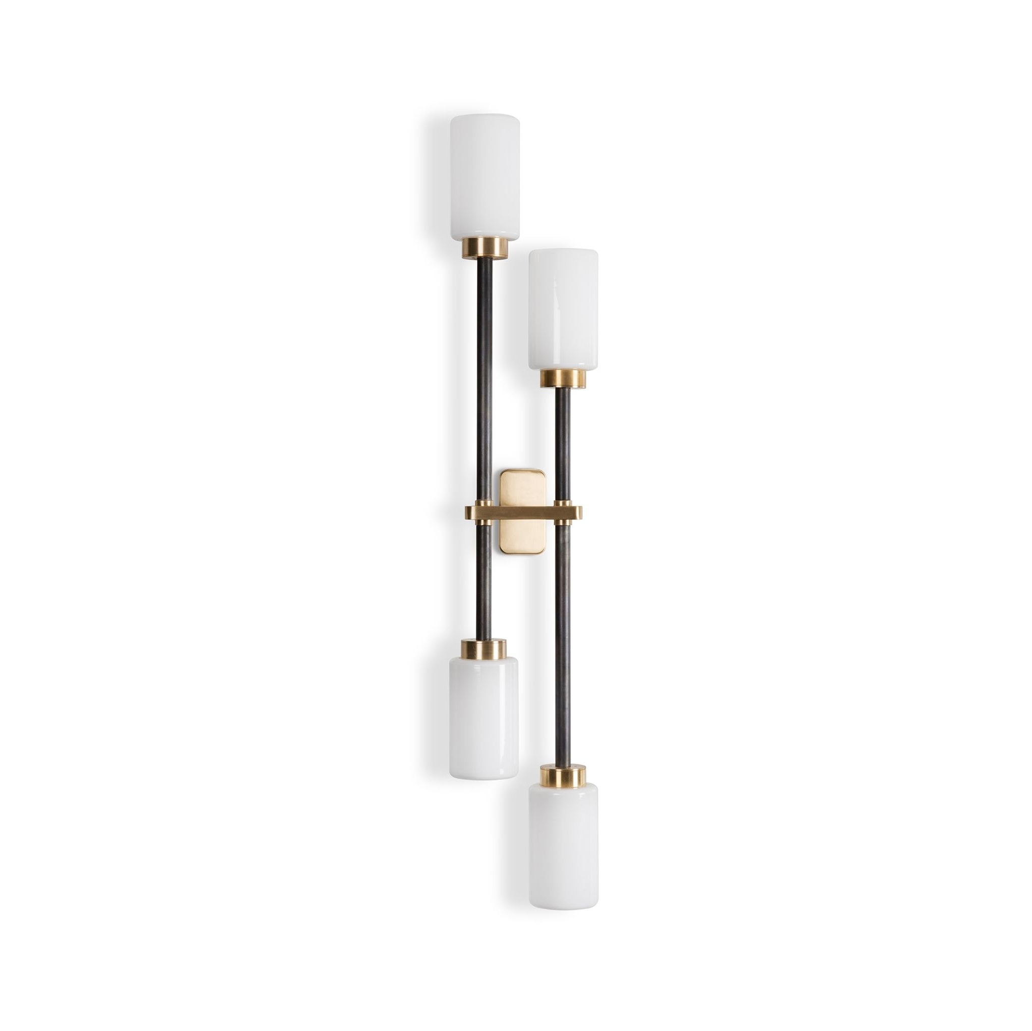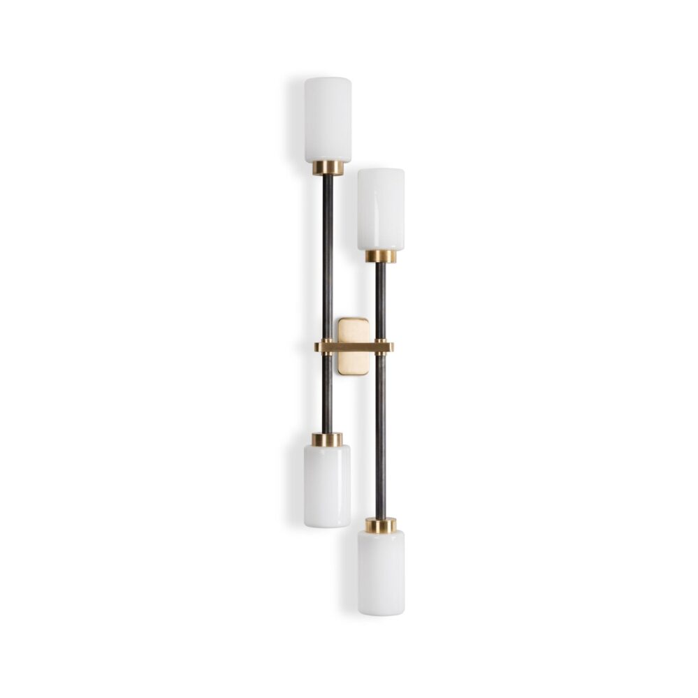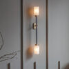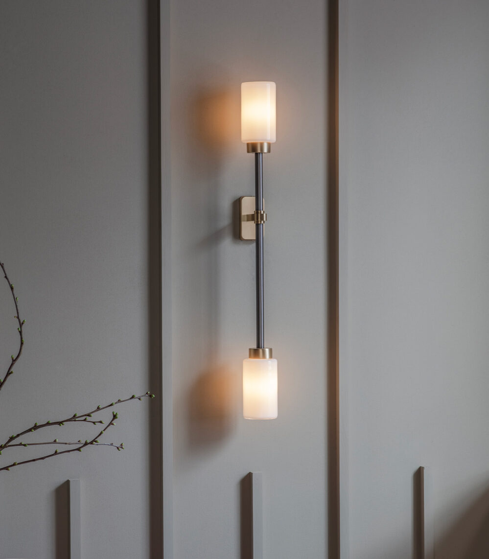 Farol Wall Light by Bert Frank is finished in brass and bronze with two/four elegant cylindrical shades to lend a touch of luxury to any living space. The Farol Wall light is available as a single or double and has the option of either opal or smoked glass shades. The double wall light also allows you to pick whether you would like it right or left-sided.