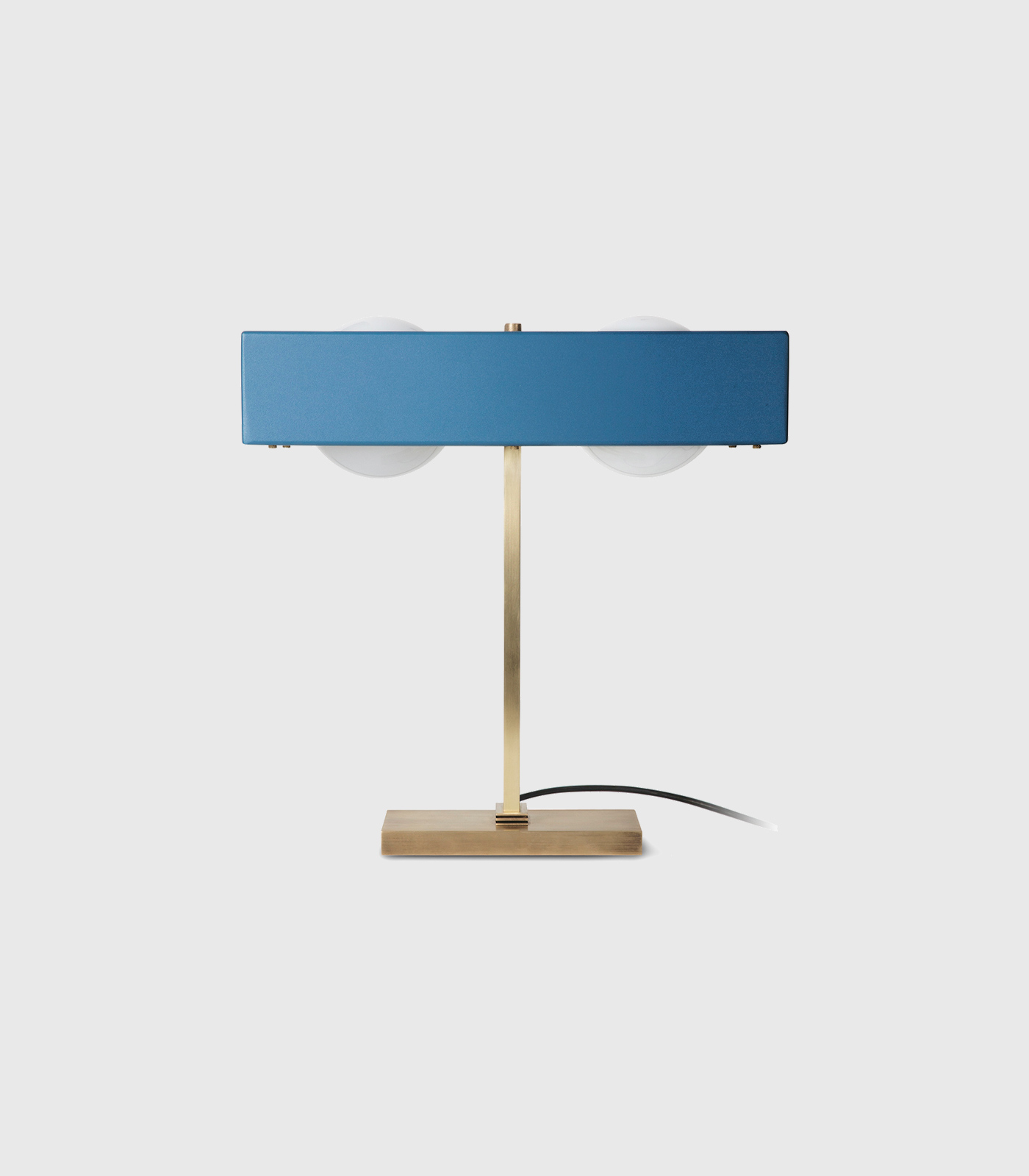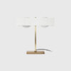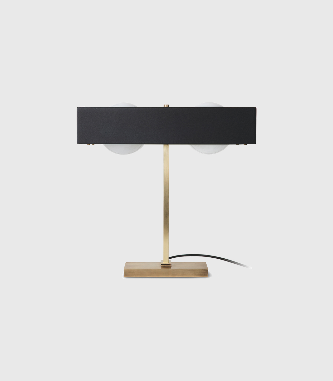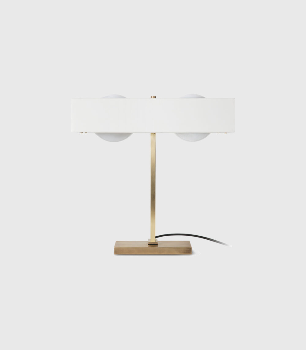 Kernel Table Lamp by Bert Frank has a solid brass base and angular form softened by the warm glow of opal glass globes. Unexpected detailing in the laser cut brass diffuser, seen only from below.