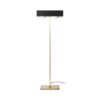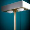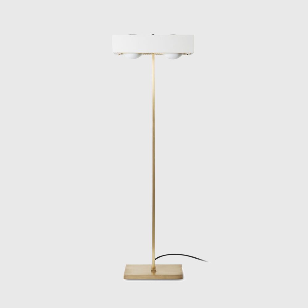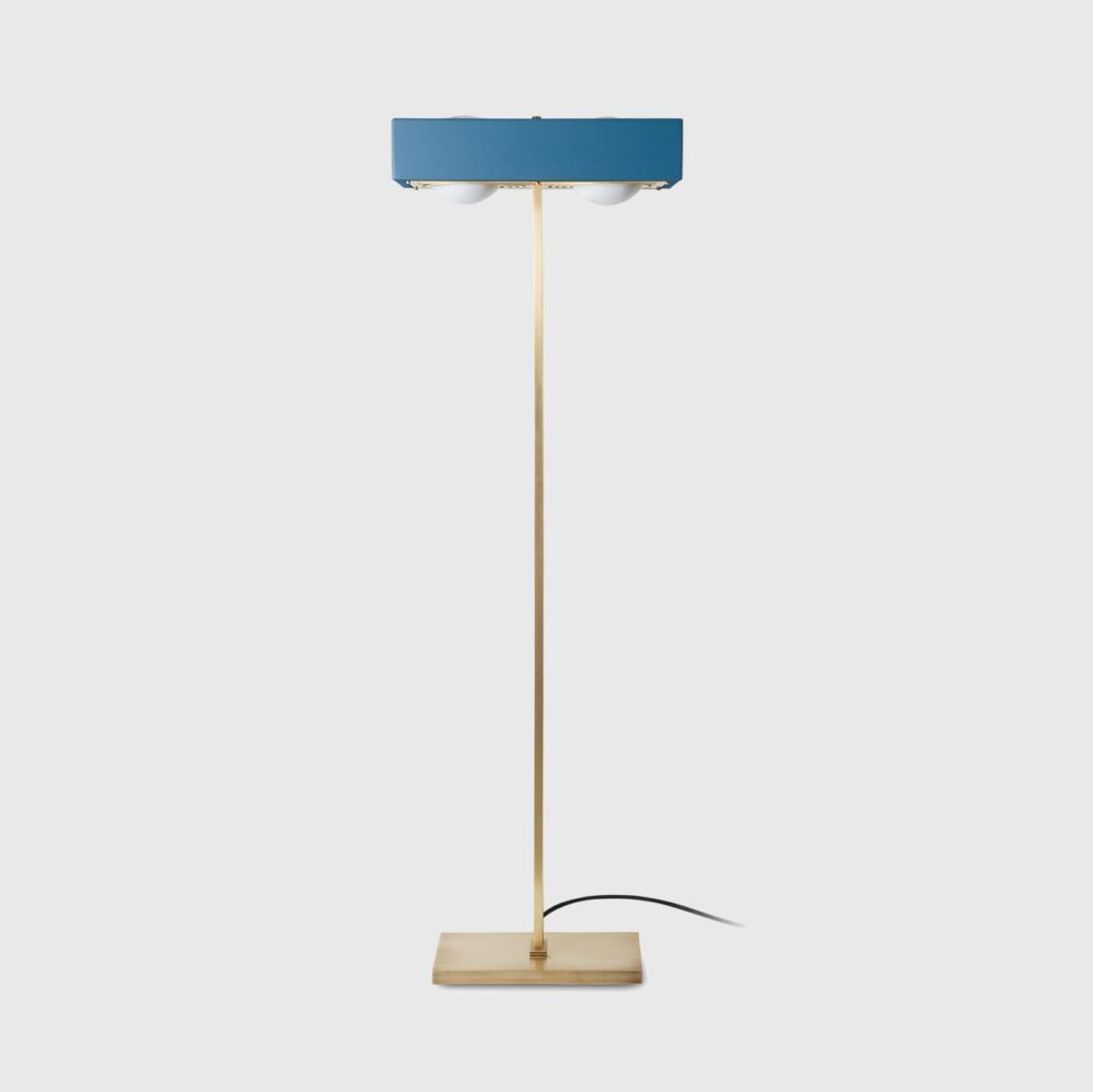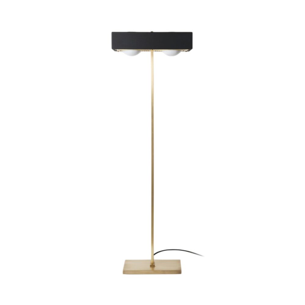 Kernel Floor Lamp by Bert Frank has a weighty, solid brass base and super-rigid double-parallel stand with a square profile. Rectangular matte-lacquered box shade with laser cut brass diffuser in a swirling design. Sharp, angular lines offset by opal glass globes cast a soft light above and below.
