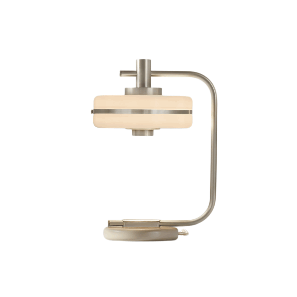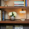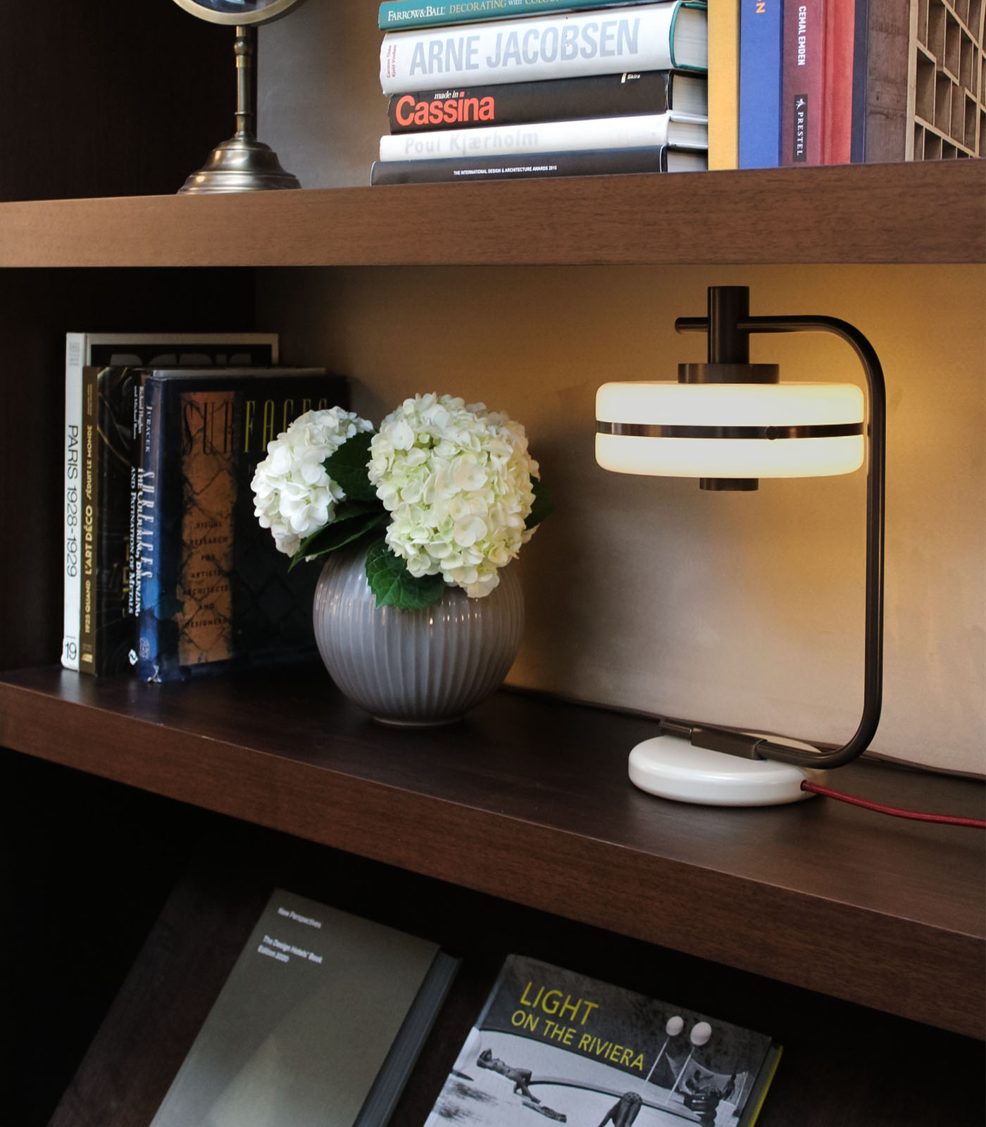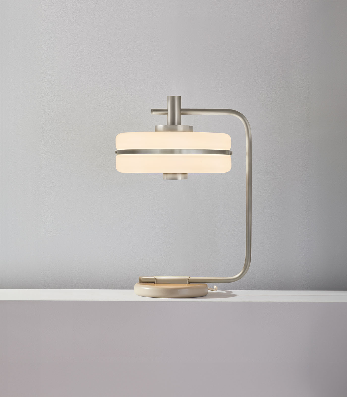 The Deco-inspired opal glass shade provides a warm, welcoming glow, while the cleverly positioned side head and stem deliver focused task lighting.