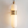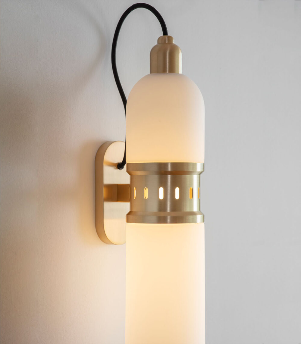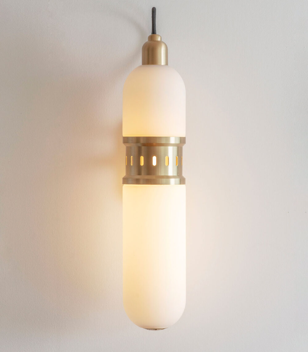 Occulo Wall Light by Bert Frank features a pill-shaped, sand-blasted glass shade and precision-etched brushed brass detailing. The eye-catching cylindrical pod-like shade glows softly with elegance, encased in a laser-etched band of brushed brass. The matte opal glass hangs from a swooping cord, fixed onto a machined-brass bracket. Sitting beside a fireplace or animating a hallway, this versatile piece brings sophistication to any wall.