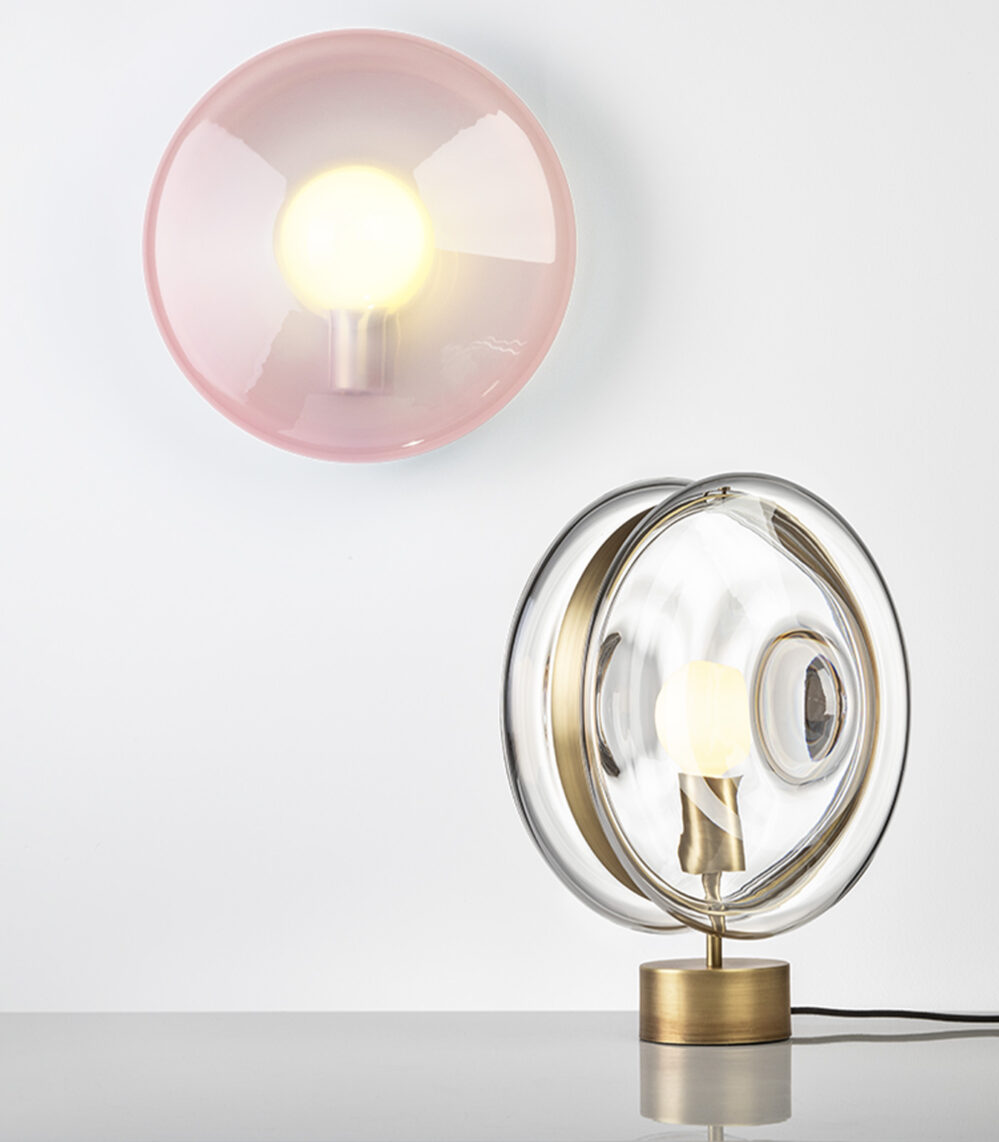 BOMMA’s Orbital traces paths of multicolored celestial bodies that glow with hypnotically red-hot cores. This ingenious design of mouth-blown glass lenses, held together by a metal mounting, creates a fascinating visual experience from many different angles. Our unique lighting objects in moonlight clear, pastel pink, sea blue, polar white and mysterious black, lend a truly magical atmosphere to any sophisticated interior.