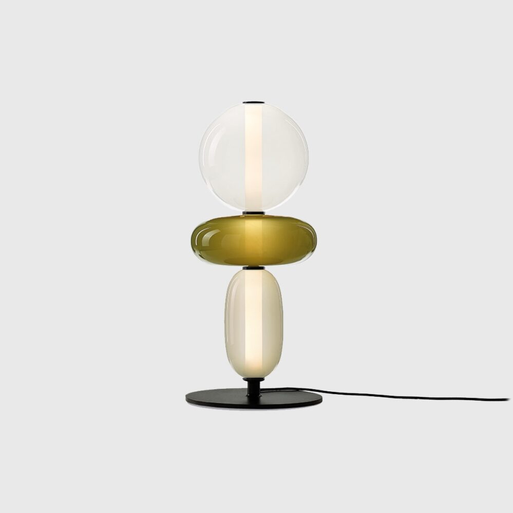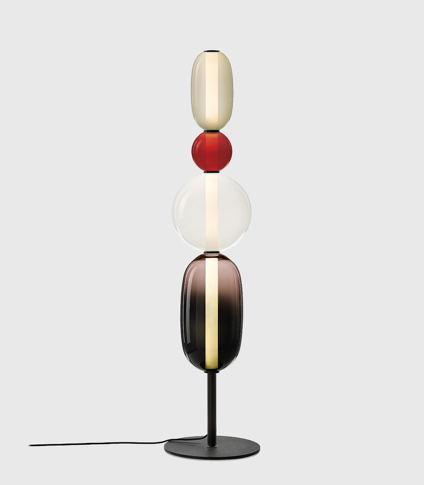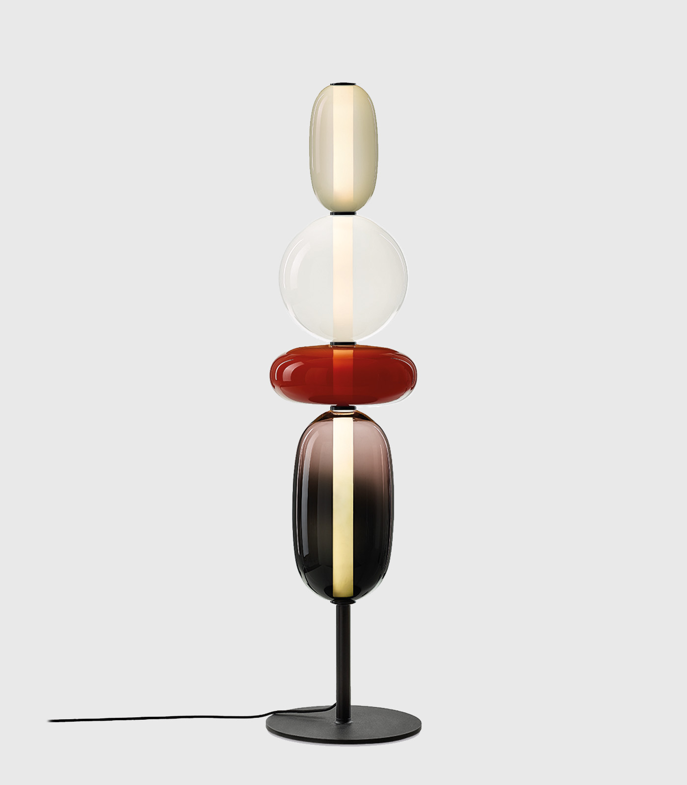 Pebbles Floor Lamp by BOMMA is from a collection inspired by the diverse shapes and colours of smooth pebbles from a summer beach, allowing you to creative distinctive combinations. The hand-blown glass elements hang as if from a string, just like colourful beads and are connected by their interior light source.