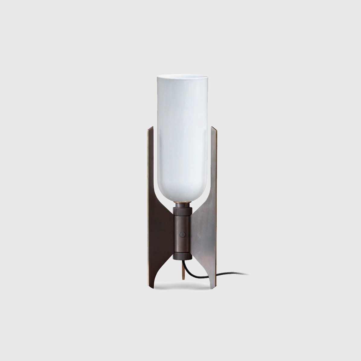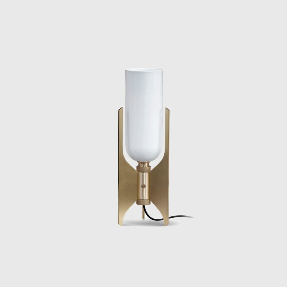 Pennon Table Lamp by Bert Frank is a solid machined-brass fins with a fine bone china cylindrical diffuser resulting in a striking linear profile. A small footprint makes it ideal for any bedside or side table.
