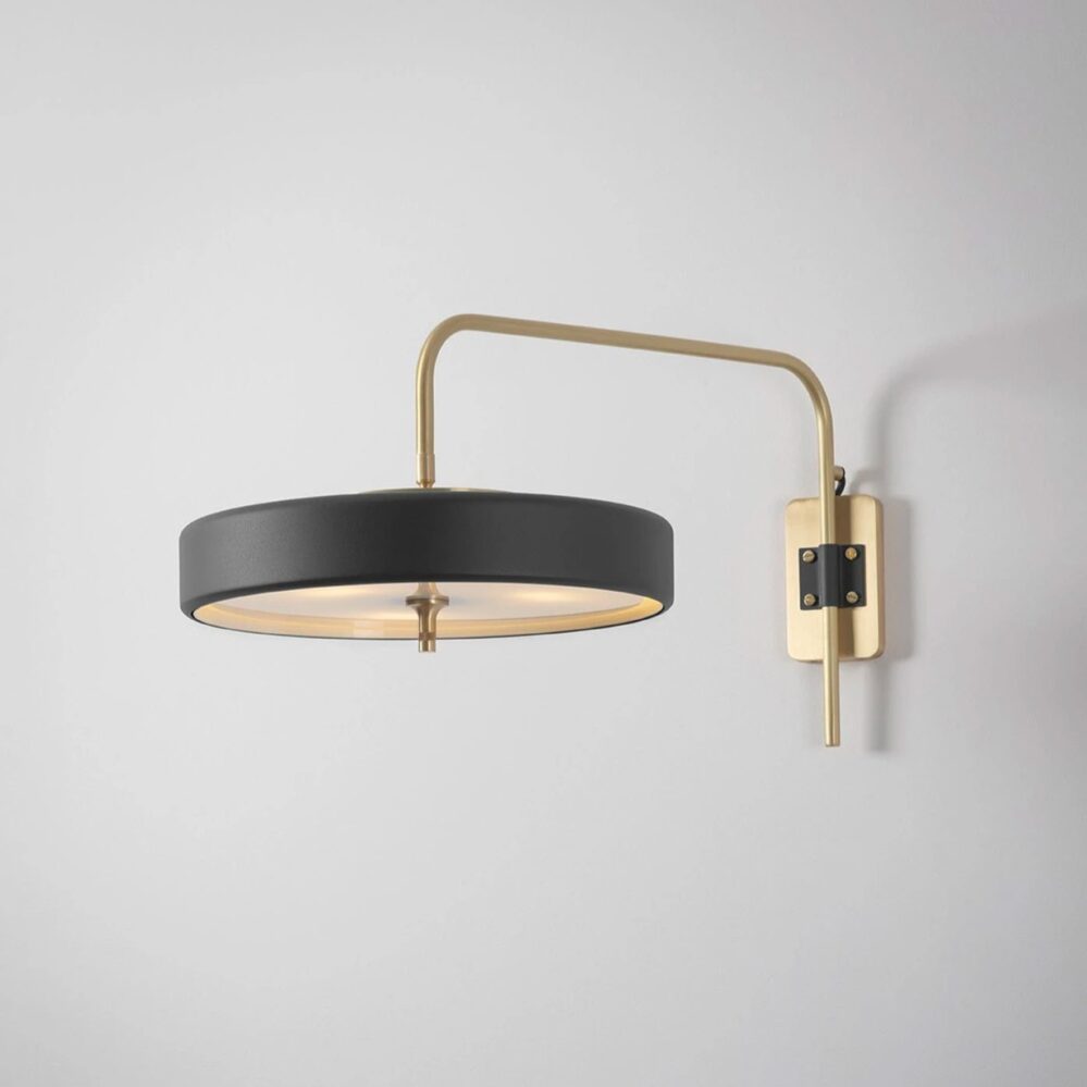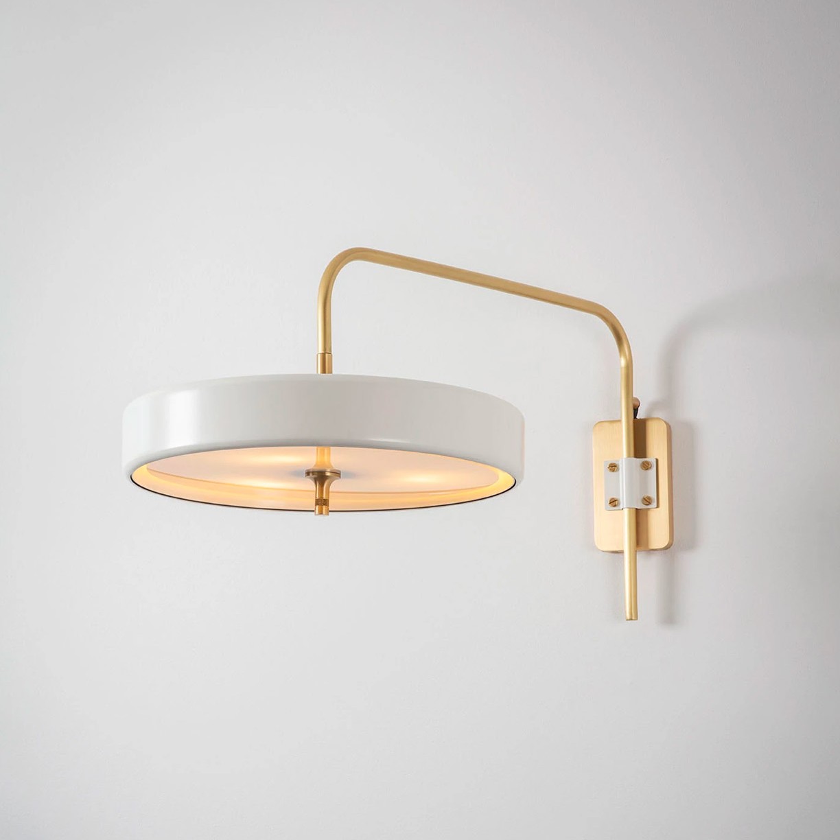 Revolve Wall Light by Bert Frank features a sleek, minimalist design. Designed to rotate through 90 degrees in a perfect arc from the wall for maximum flexibility. Casts a soft, warm light from an opal diffuser, framed in a matte-lacquered spun-metal shade. The Revolve collection features a pendant light, table lamp and floor lamp variations.