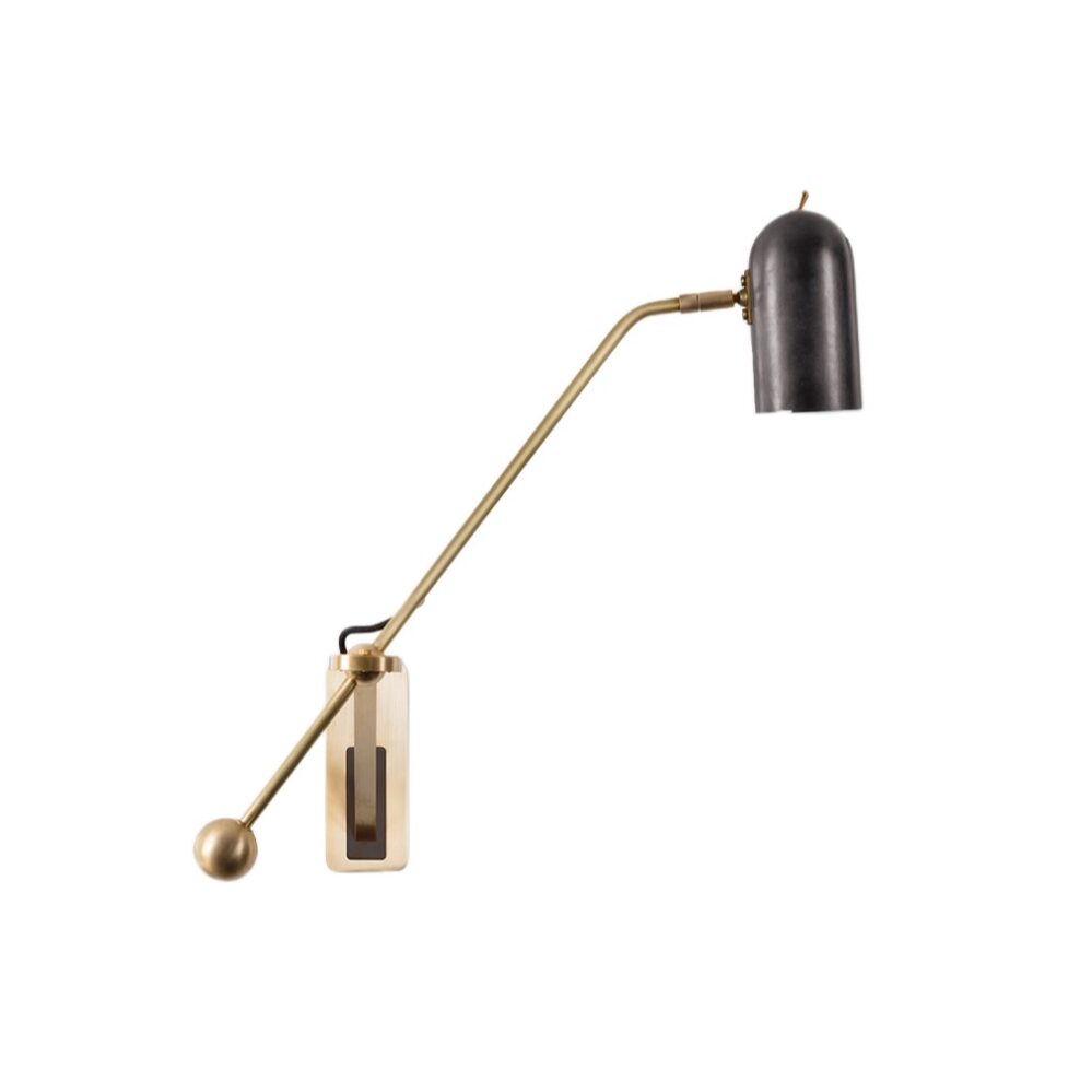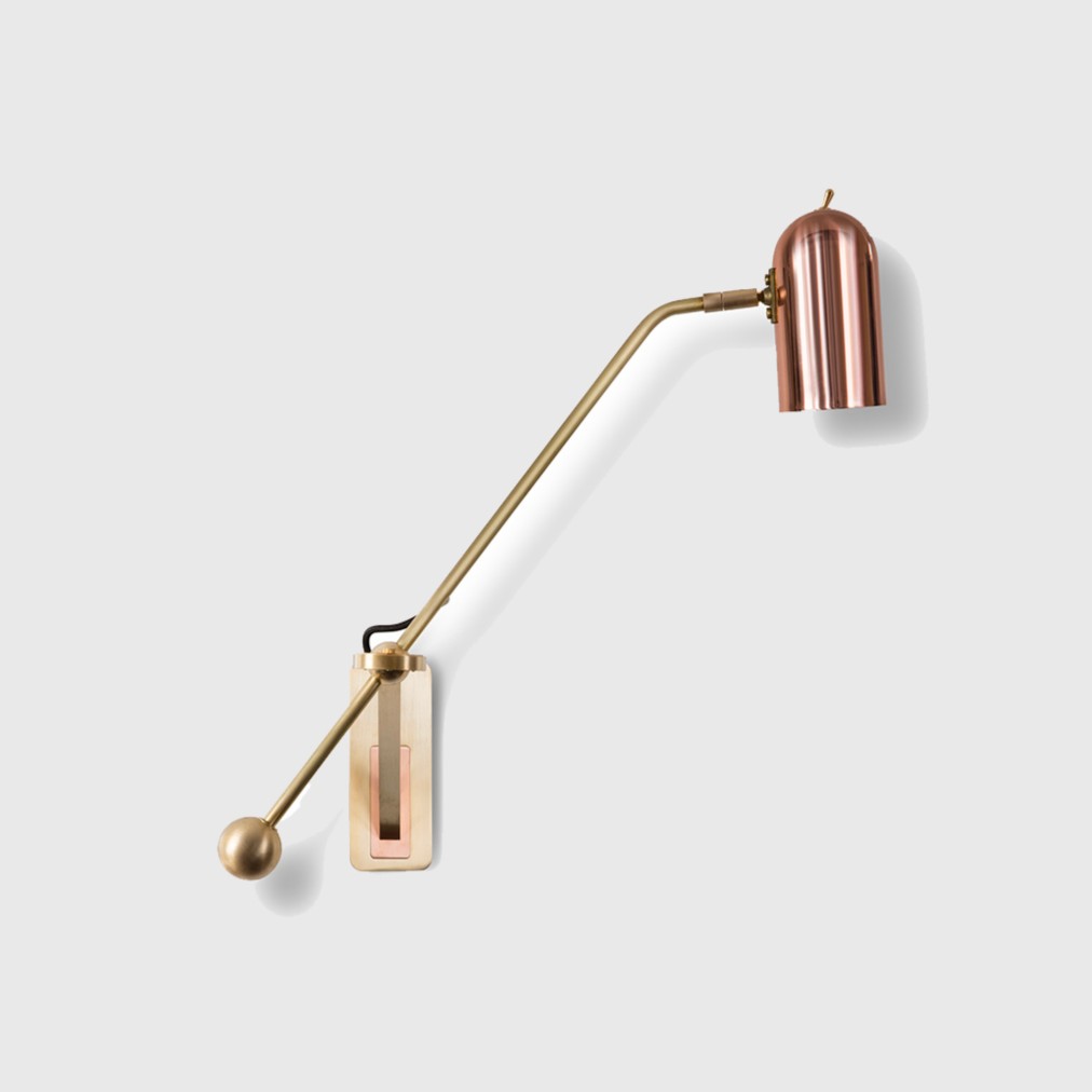 Stasis Wall Light by Bert Frank is where Polished copper meets satin-finish brass. Solid brass backplate with a copper insert. Adjustable brass arm and copper shade. The precision of the engineering – a quality recognisable in all Bert Frank pieces – is very much on show in the Stasis collection. The ball joint that lies at the heart of each lamp is also the point of equilibrium.